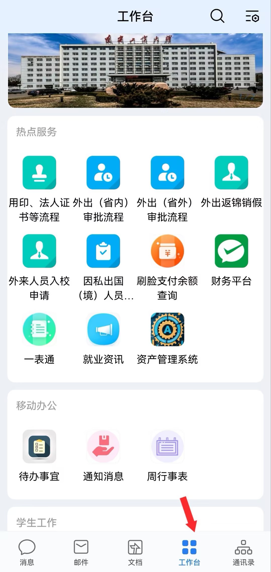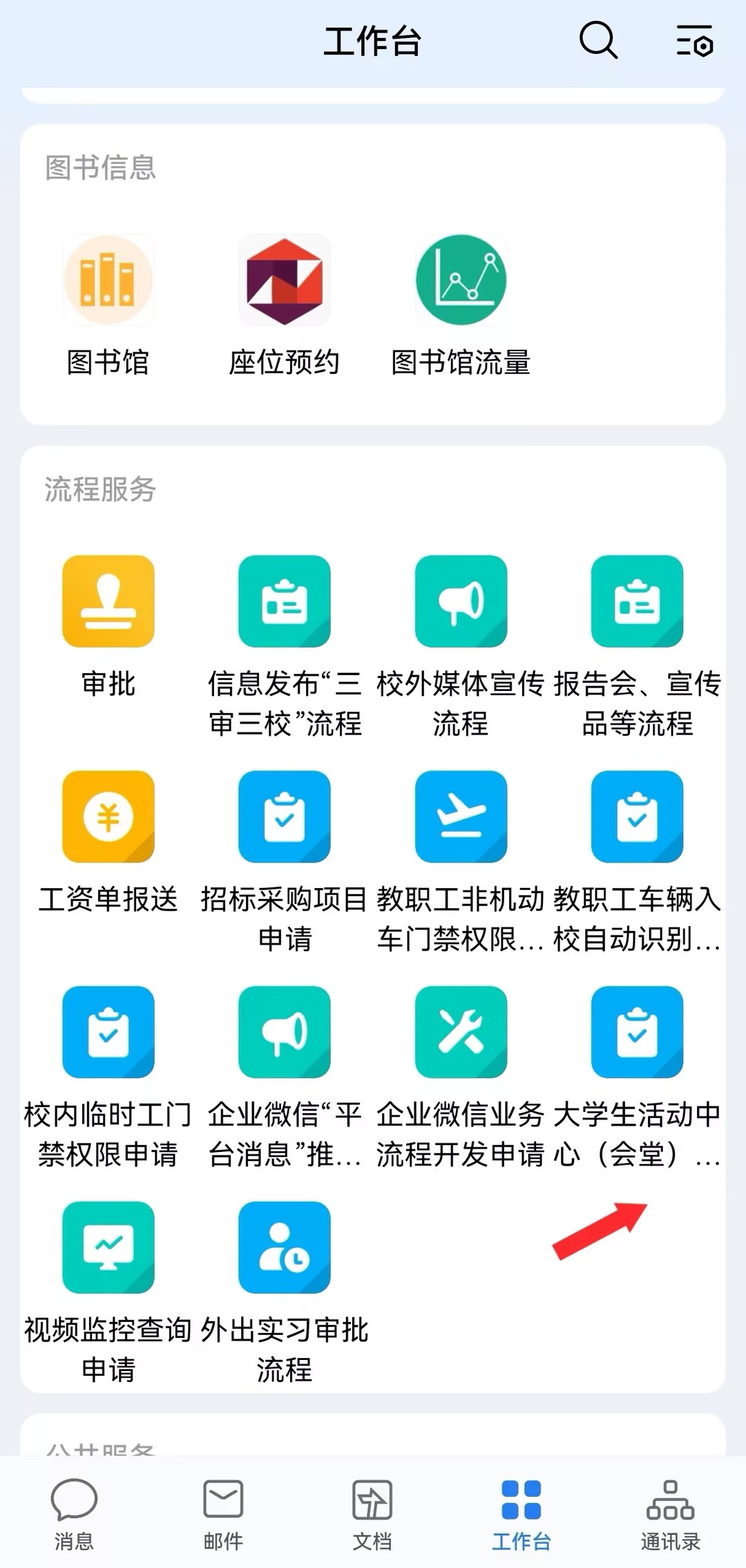 打开企业微信 → 点击底部【工作台】 → 找到【大学生活动中心(会堂)使用申请】板块 → 点击进入并填写提交。